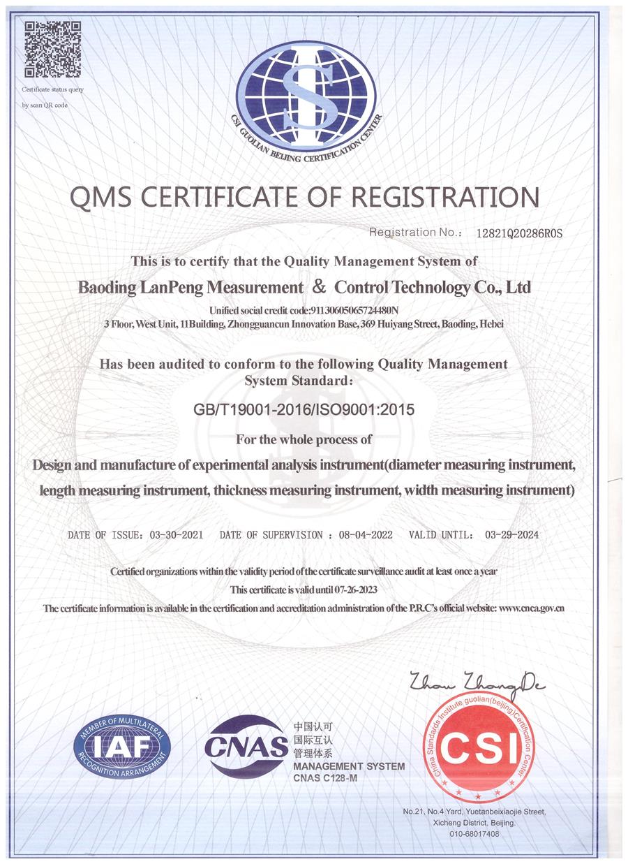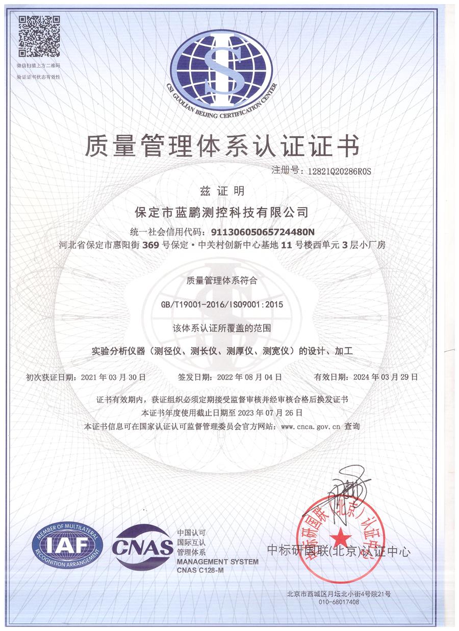 获得该认证,表明保定市蓝鹏测控科技有限公司的质量管理体系符合质量管理体系及相关要求,是对公司作为仪器设计加工商的认可,这有利于进一步提升公司的综合竞争力,为公司在仪器相关市场奠定了良好的基础。