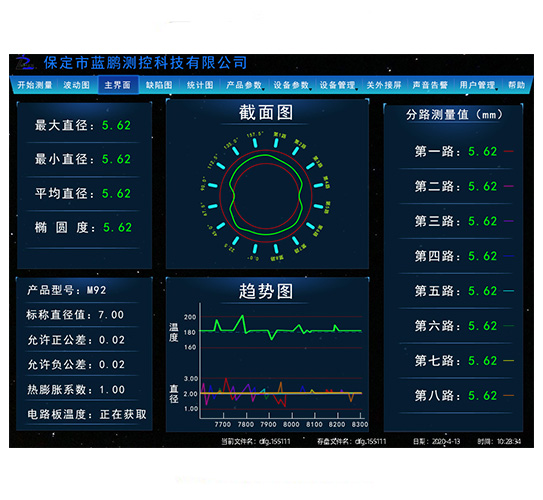 以测径系统主界面为例,简单介绍一下。菜单栏依次为开始测量、波动图、主界面、缺陷图、统计图、产品参数、设备参数、设备管理、关外接屏、声音告警、用户管理、帮助。而主界面显示被测轧材的基础参数及各个测量值,同时显示了截面图与趋势图。这些都是非常重要的。