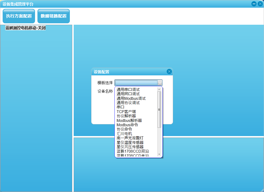 平台可以通过设备库的不断开发扩展以及完善,来实现单个设备的调试或若干设备的联调。通过设备的组合来实现具体的解决方案。
