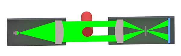 发射镜头内置一个点光源,点光源发出的光通过透镜系统(即镜片组)后形成准直平行光视场。准直平行光直接射向接收镜头,经过接收镜头内的透镜系统后聚焦,通过位于焦点位置的光阑小孔后在CCD芯片上成像。当视场中通过被测物时,被测物遮挡的部位将在CCD上出现一个边界清晰的阴影。根据阴影的长度显示外径尺寸。光电测径仪的测量区域就是平行光视场区域(就如手电筒的光打出的光束,只不过是将光束变成平行光束),一般为绿色平行光视场(可定制其它颜色)。