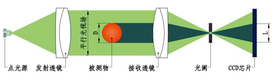 相交的线会越来越远,而平行线则每个位置都是相等的距离,在线测径仪就是利用了这一特性来完成检测的,从点光源发射的光线经过发射透镜组变成平行光,照射被测物后,则可获得与被测物尺寸一致的阴影,而通过计算阴影的尺寸即可得到准确的外径尺寸,同时为了避免其它光线的影响,采用绿色光源的同时安装滤光镜片,除绿色光源外的其他颜色光源的影响基本可忽略不计,根据使用环境不同也可定制成其他颜色光源。当然其中要解决的问题依然不少,如何形成平行光、边缘照射清晰度等。