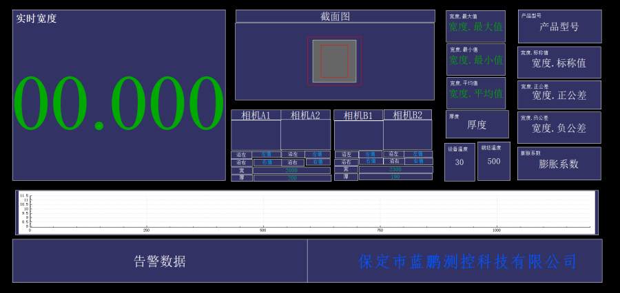 运行桌面的快捷方式进入如下主界面,在主显示区的左上实时宽度显示区显示的内容是实时测量到的宽度,然后依次往右是截面图,把实时宽度数值图形化显示出来。截面图的下方是四个相机的显示图像(二值化处理后),包括每个相机的左侧右侧像素位置,两个相机的位置计算出来的厚度,四个相机结合厚度计算出来的宽度等等值。再往右侧是当前选择的产品型号和标称公差等信息,如果当前实时宽度超出了标称公差,显示数据会变色(上超差红色、下超差黄色、正常绿色),同时会发出声光报警。下面是趋势图,可以显示随时间变化的宽度变化。