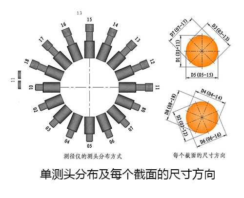 主控室液晶显示器:管材截面的最大/最小直径、平均值、椭圆度;各路测头的分项测量值;设定的钢管长度、速度、标称直径、上下公差等;尺寸波动趋势预报(输入钢管长度和速度后可以对应外径在管材的位置),缺陷分析曲线。