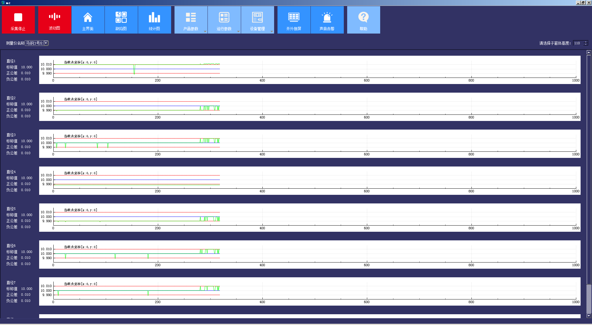 包括工具栏菜单,及主界面、波动图、缺陷图、统计图四个数据显示窗口。
